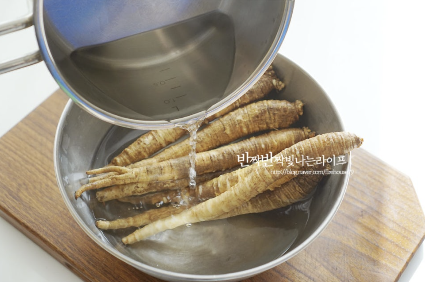달군 팬에 참기름 밑간 한 더덕을 올리고